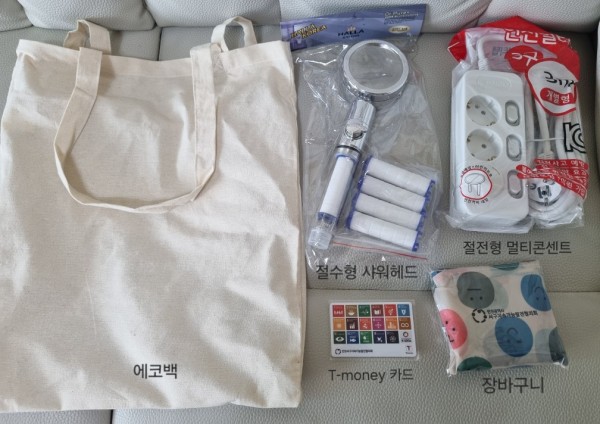 구성품은 에코백, 절수형 샤워헤드, 절전형 멀티콘센트, 장바구니, T-money 카드 등 실생활에서 유용하게 사용할 수 있는 물품으로 이루어져 있어 만족스러웠습니다.